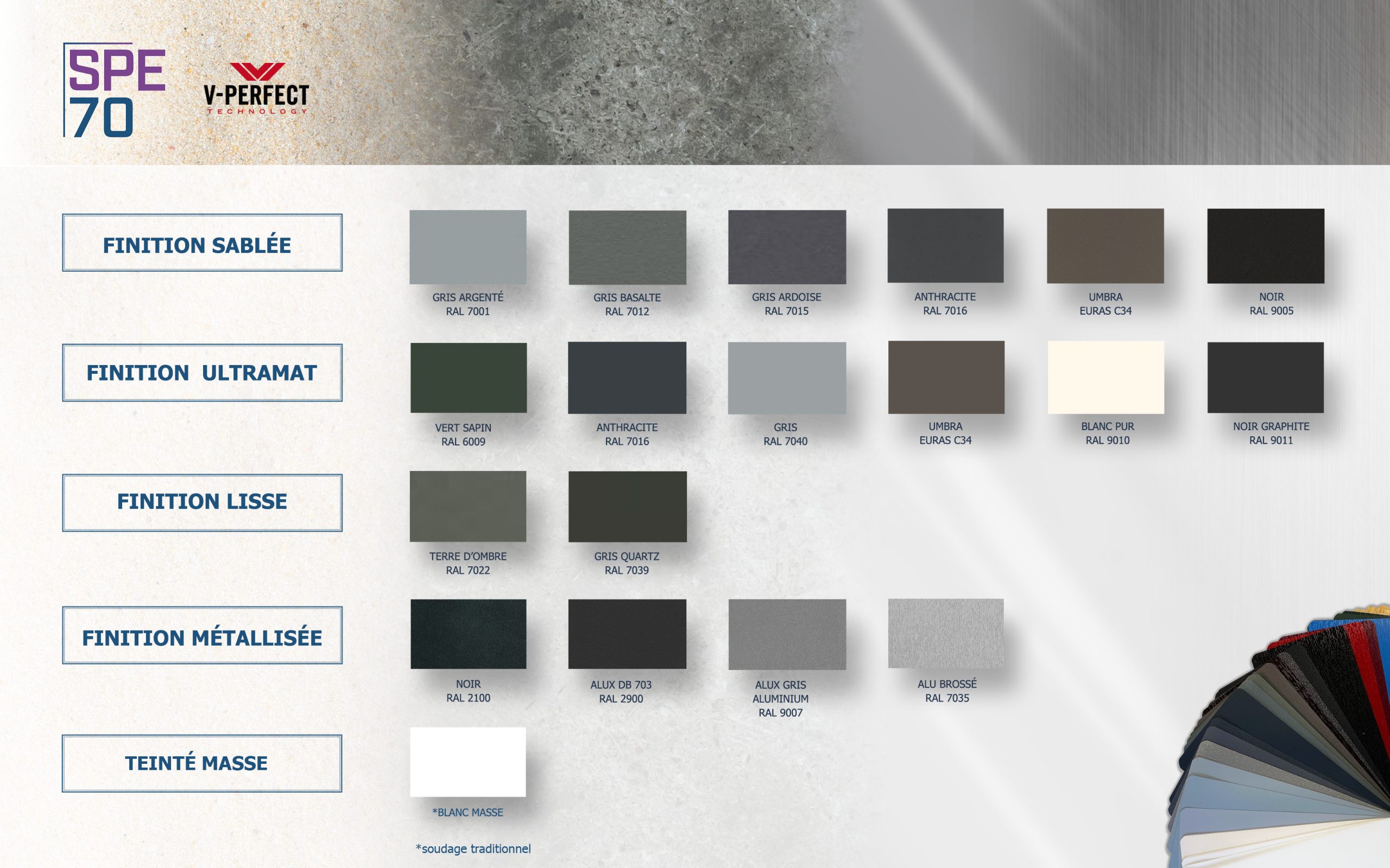 La gamme SPE 70 regroupe l’ensemble des teintes contemporaines idéales pour les architectures actuelles s’approchant de l’esthétique de l’aluminium.